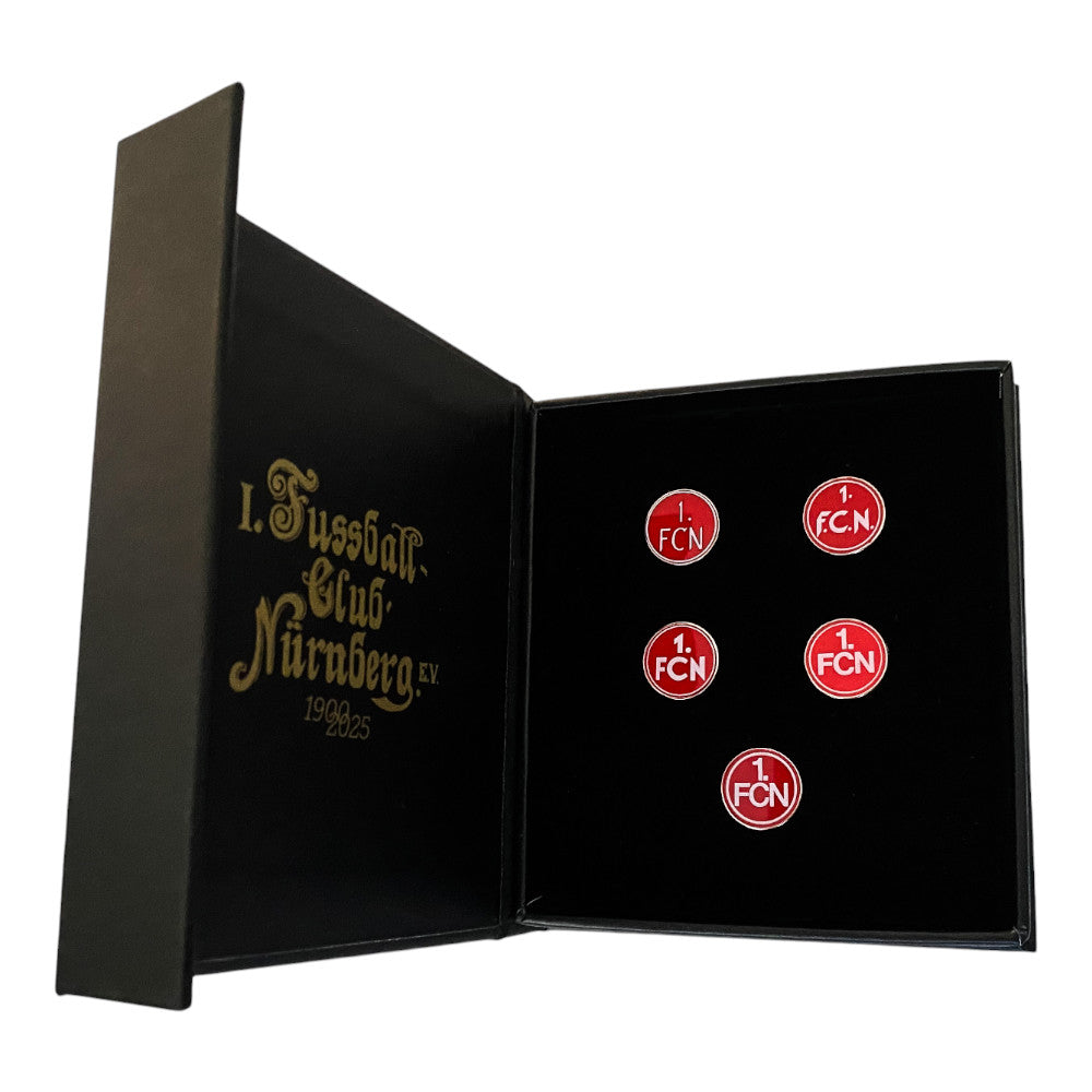 This exclusive pin set takes you on a journey through the eventful history of 1. FC Nürnberg. Presented in an elegant collector's box, the set features five intricately detailed pins depicting the club's various crests from different eras – from its beginnings to the present day.