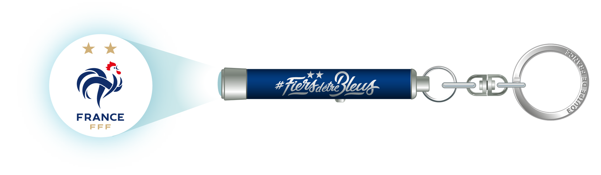 This innovative FFF keyring combines functionality with fandom, featuring a built-in LED light that illuminates the iconic rooster emblem and the inspiring “Fiers d’être Bleues” slogan on its surface.