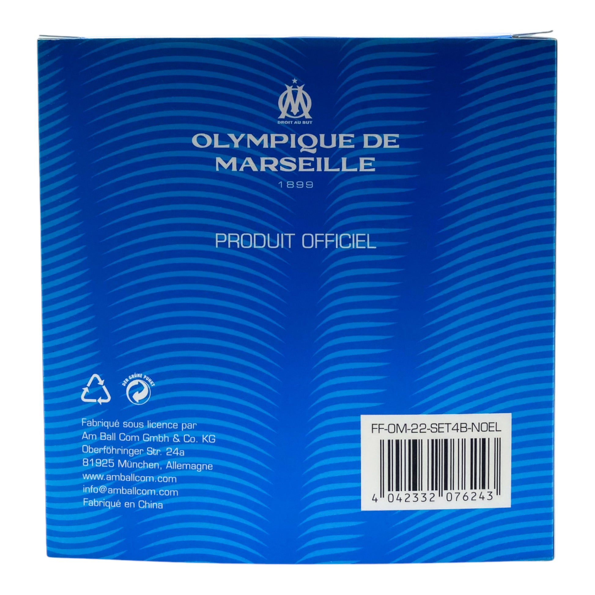 The set features four elegant Christmas baubles in the club's iconic blue and white colors, each adorned with the OM crest and the club's motto, "Droit au But". These ornaments are perfect for celebrating your love for OM during the festive season, whether hung on your Christmas tree or displayed as stylish home accents.