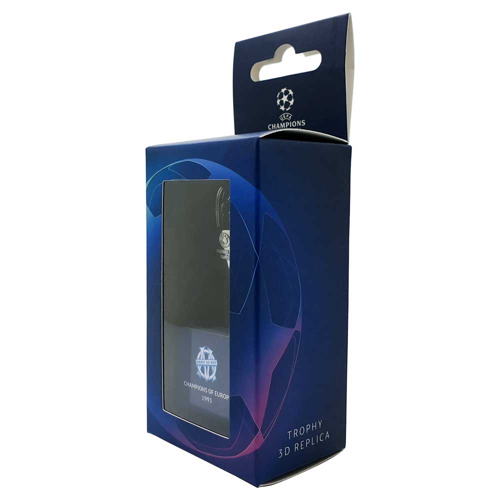 This 45 mm UEFA Champions League trophy replica is mounted on a polished wooden pedestal featuring the Olympique de Marseille logo base. It proudly commemorates Marseille’s historic 1993 triumph as the first French club to win Europe’s top competition.