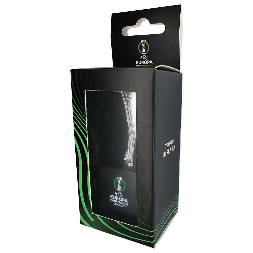 This UEFA Europa Conference League trophy replica, elegantly mounted on a wooden pedestal, offers a refined and classic display piece for fans and collectors.
