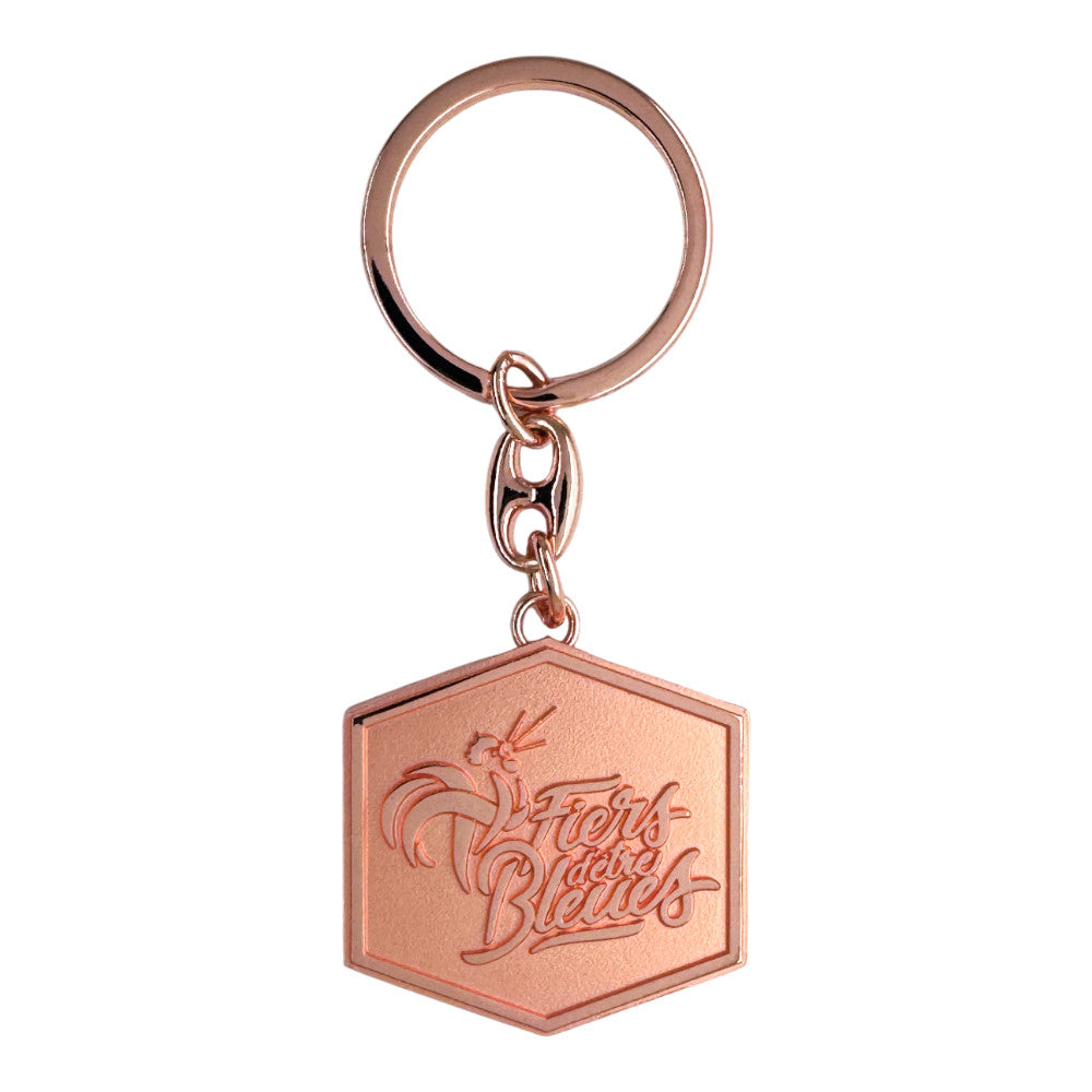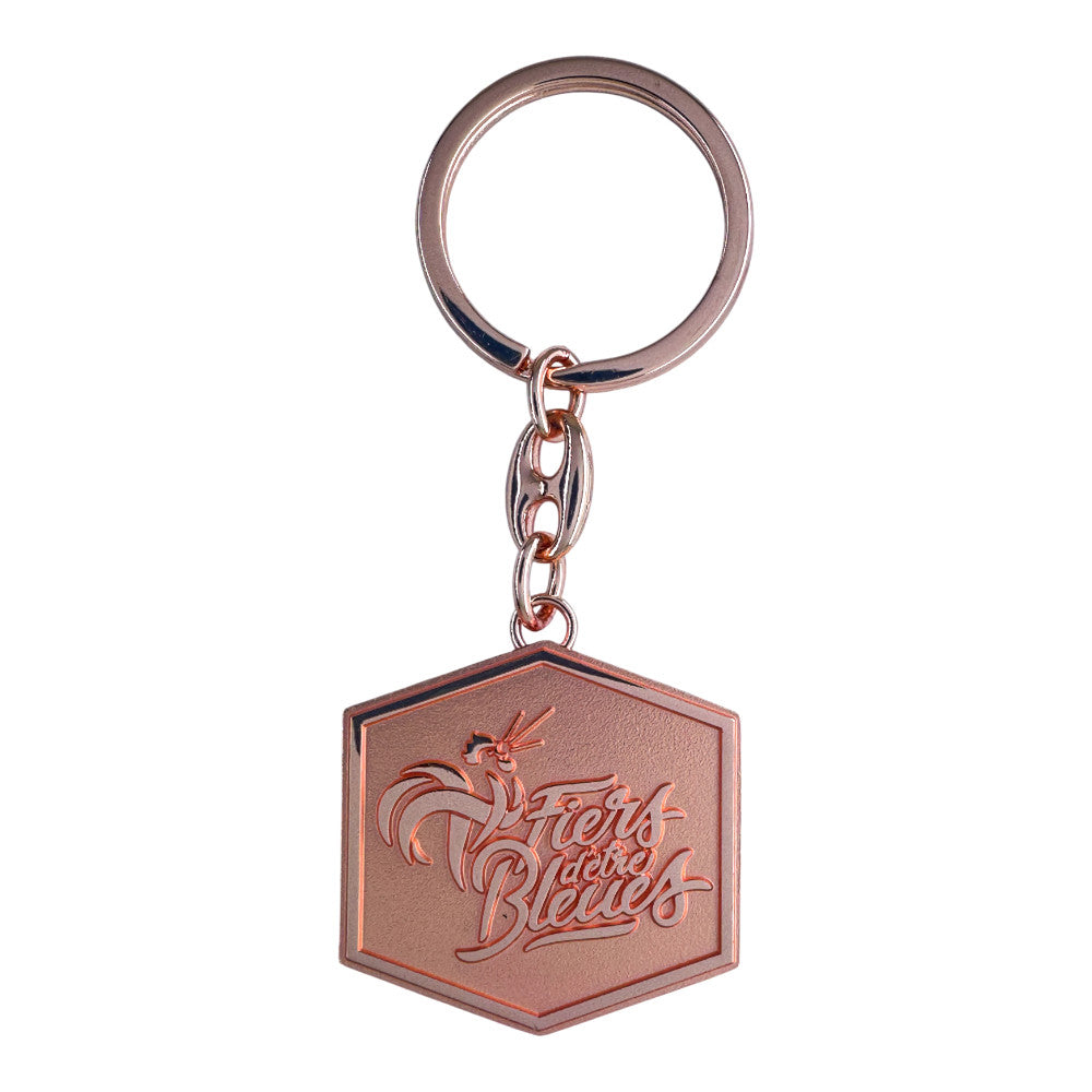 Dieser elegante Schlüsselanhänger glänzt in einem warmen Roségold- Finish und verfügt über einen sechseckigen Anhänger mit der eingravierten Aufschrift „Fiers d'être Bleues“ und dem ikonischen französischen Hahn.